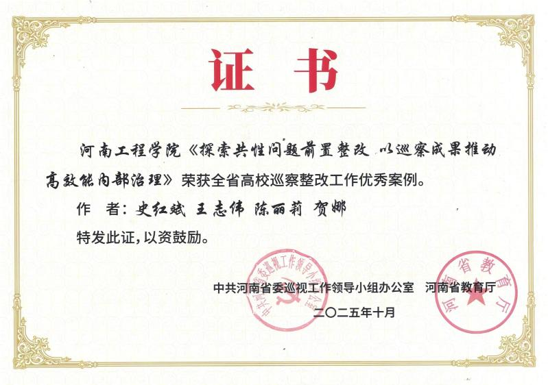 在河南省委巡视办、省教育厅主办的河南省管高校巡察整改工作培训会上,学校党委巡察办公室报送的《探索共性问题前置整改 以巡察成果推动高效能内部治理》案例,从101份征集案例中脱颖而出,入选河南省高校巡察整改工作优秀案例集,为省管高校巡察整改工作提供了宝贵实践参考。