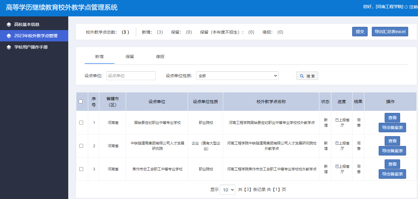 学校高度重视高等学历继续教育校外教学点建设工作,校长李利英多次就高等学历继续教育校外教学点建设作出工作指示,明确要求继续教育学院要严格按照教育部、省教育厅有关政策要求,切实做好校外教学点建设工作。我校继续教育学院按照李校长的指示精神,认真学习研究教育部、省教育厅有关文件要求,从2022年9月份启动我校高等学历继续教育校外教学点培育遴选工作,经过实地调研考察,结合申报单位实际情况并根据校长办公会议精神,最终从8家申报单位中,遴选出固始县世纪职业中等专业学校、焦作市总工会职工中等专业学校、中铁隧道局集团有限公司人才发展研究院等3家单位作为合作单位向教育部进行了申报并成功获批。