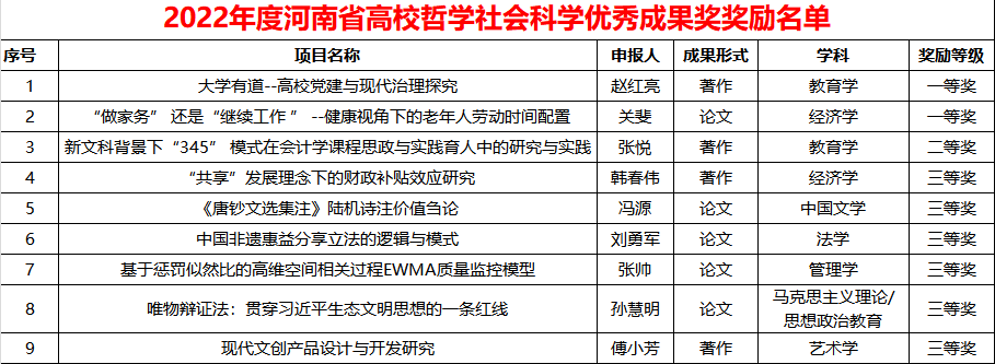 近日,河南省教育厅公布了2022年度河南省高等学校哲学社会科学研究成果奖评选结果。我校共获奖9项,其中一等奖2项、二等奖1项、三等奖6项,获奖总数及比例创历年新高。