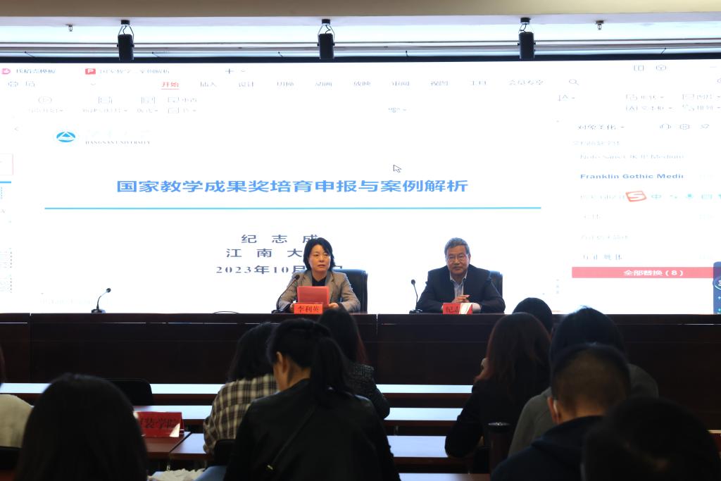 10月30日上午,学校在综合楼一楼会议室召开国家教学成果奖培育申报与案例分析培训会,江南大学原副校长纪志成教授主讲,各学院院长、教学副院长、2023年度教学成果奖培育项目负责人及教务处相关人员参会,校长李利英主持会议。