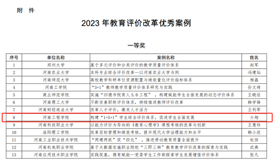 近日,在河南省教育厅办公室公布了2023年教育评价改革优秀案例,我校荣获一等奖1项,二等奖2项。