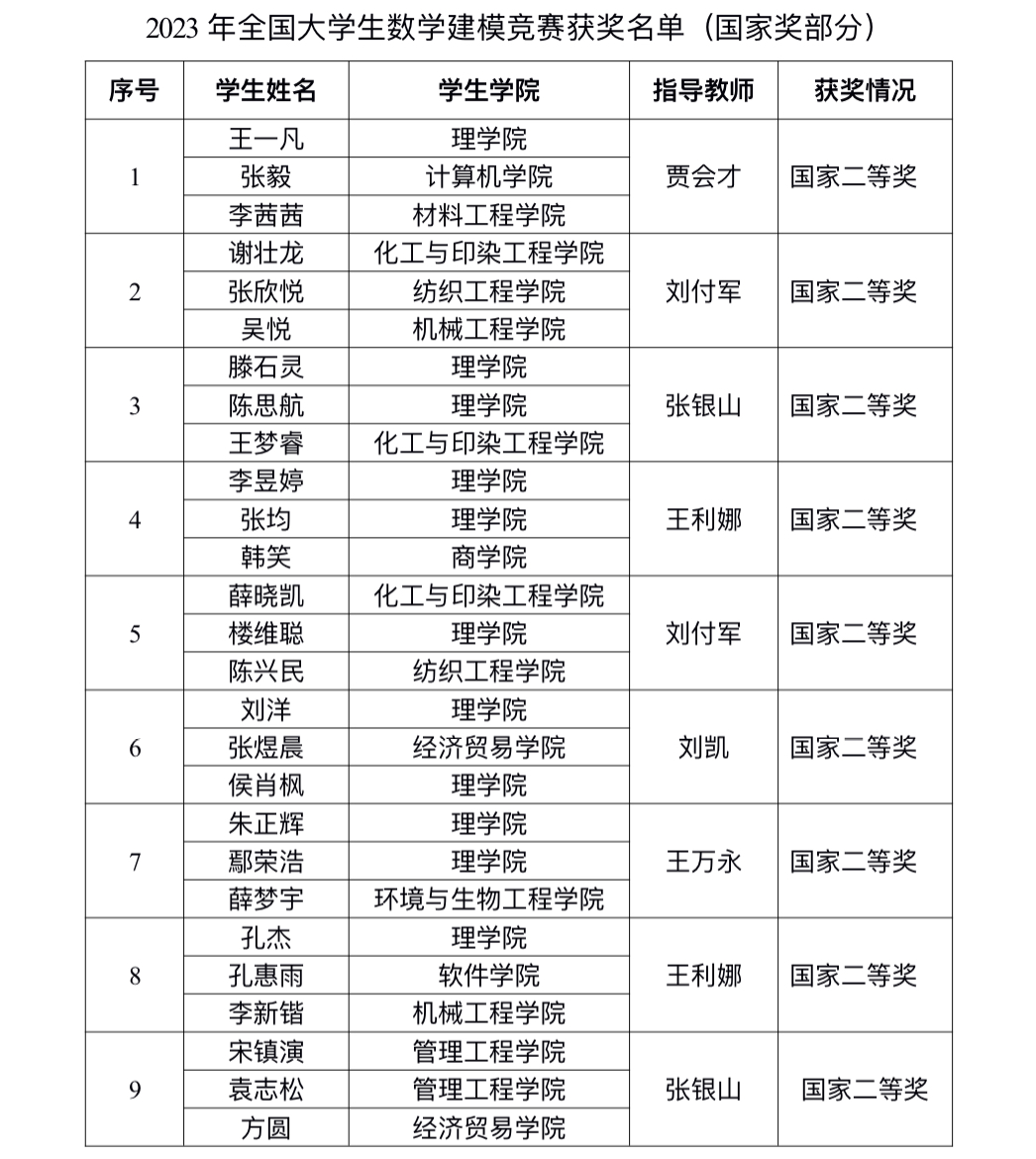 近日,2023年全国大学生数学建模竞赛获奖名单公布,我校学子喜获国家二等奖9项、省一等奖23项、省二等奖15项、省三等奖6项。来自理学院、计算机学院、会计学院、化工与印染工程学院等16个学院的168名学子组成的56支队伍参加了为期4天的激烈角逐,总体获奖率为94.64%,其中国家奖和省一等奖获奖比例分别为16.07% 和41.07%,获奖率位居河南省高校前列。