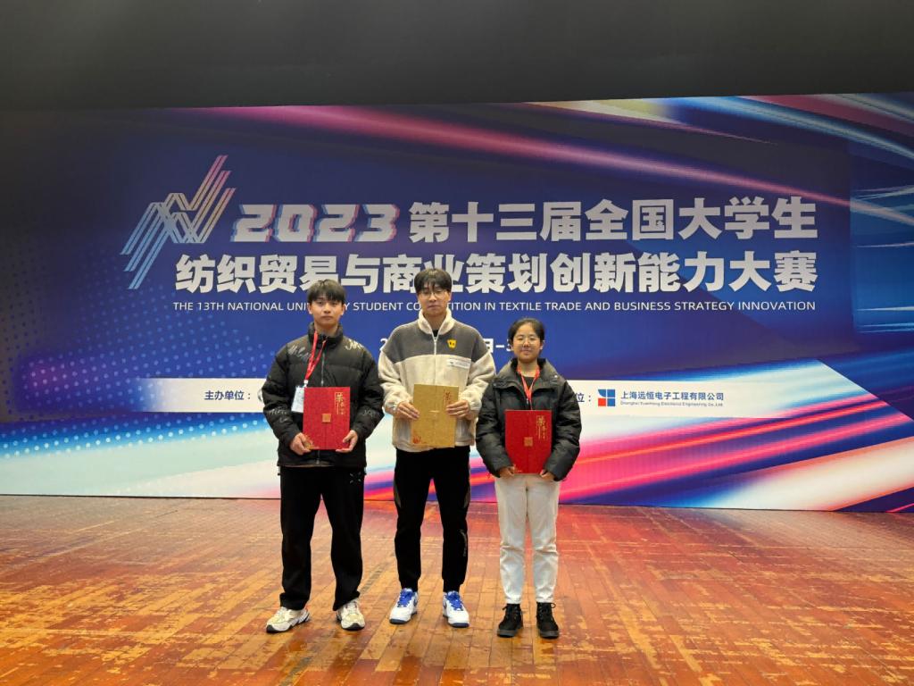 12月2日,第十三届全国大学生纺织贸易与商业策划创新能力大赛全国总决赛圆满落幕。华亿在线手机版(大中国区)纺织工程学院代表队的学子在孔繁荣与贾琳两位老师的指导下,历经数月准备时间,最终凭借出色的表现和扎实的实力,在众多参赛选手中脱颖而出,获得一等奖1项,三等奖2项的佳绩。其中纺织工程专业的朱钱钱荣获(本科组)个人一等奖,高爽均荣获(本科组)个人三等奖;陈兴民、马明泽、吕嫚荣三位同学荣获商业策划创新奖(本科组)三等奖。