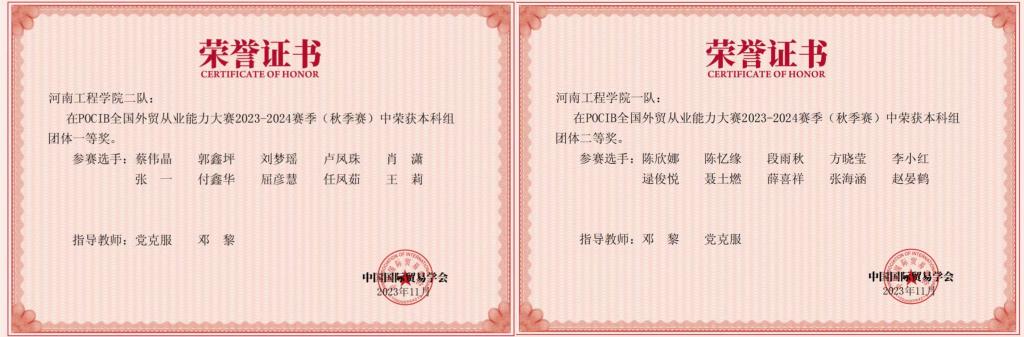 近日,由中国国际贸易学会主办的第十三届 POCIB 全国外贸从业能力大赛2023-2024赛季(秋季赛)成绩揭晓,我校本科二队荣获团体一等奖,本科一队荣获团体二等奖,张一、肖潇、卢凤珠 、刘梦瑶、郭鑫坪、蔡伟晶 、陈欣娜等同学荣获个人三等奖。