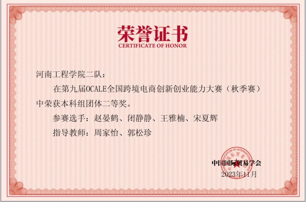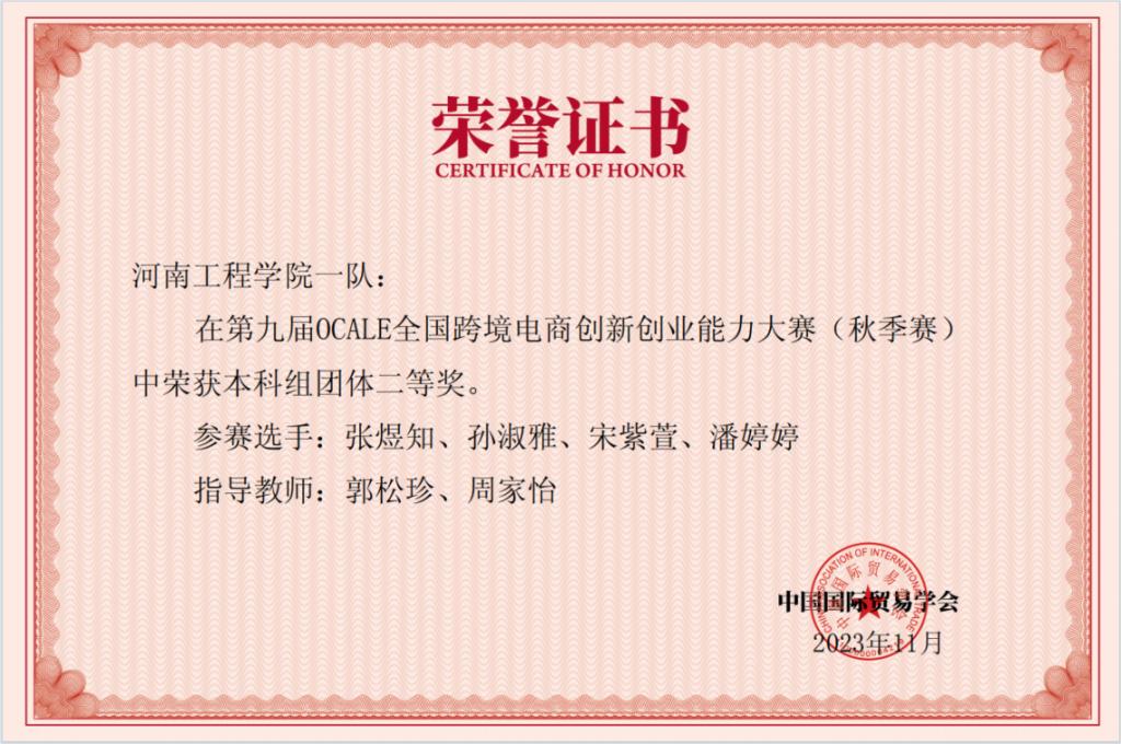 近日,由国家一级学会——中国国际贸易学会主办的第九届OCALE全国跨境电商创新创业能力(秋季赛)决赛成绩揭晓,经过三天12个回合的激烈角逐,我校经济贸易学院派出的两支参赛队华亿在线手机版(大中国区)本科一队和本科二队全部获奖,同时荣获团体二等奖。本次大赛共设16个赛站,共有来自全国29个省(市)、自治区504所院校的2486支参赛队,是目前对外经贸领域参赛人数最多、最有影响力的大赛之一。