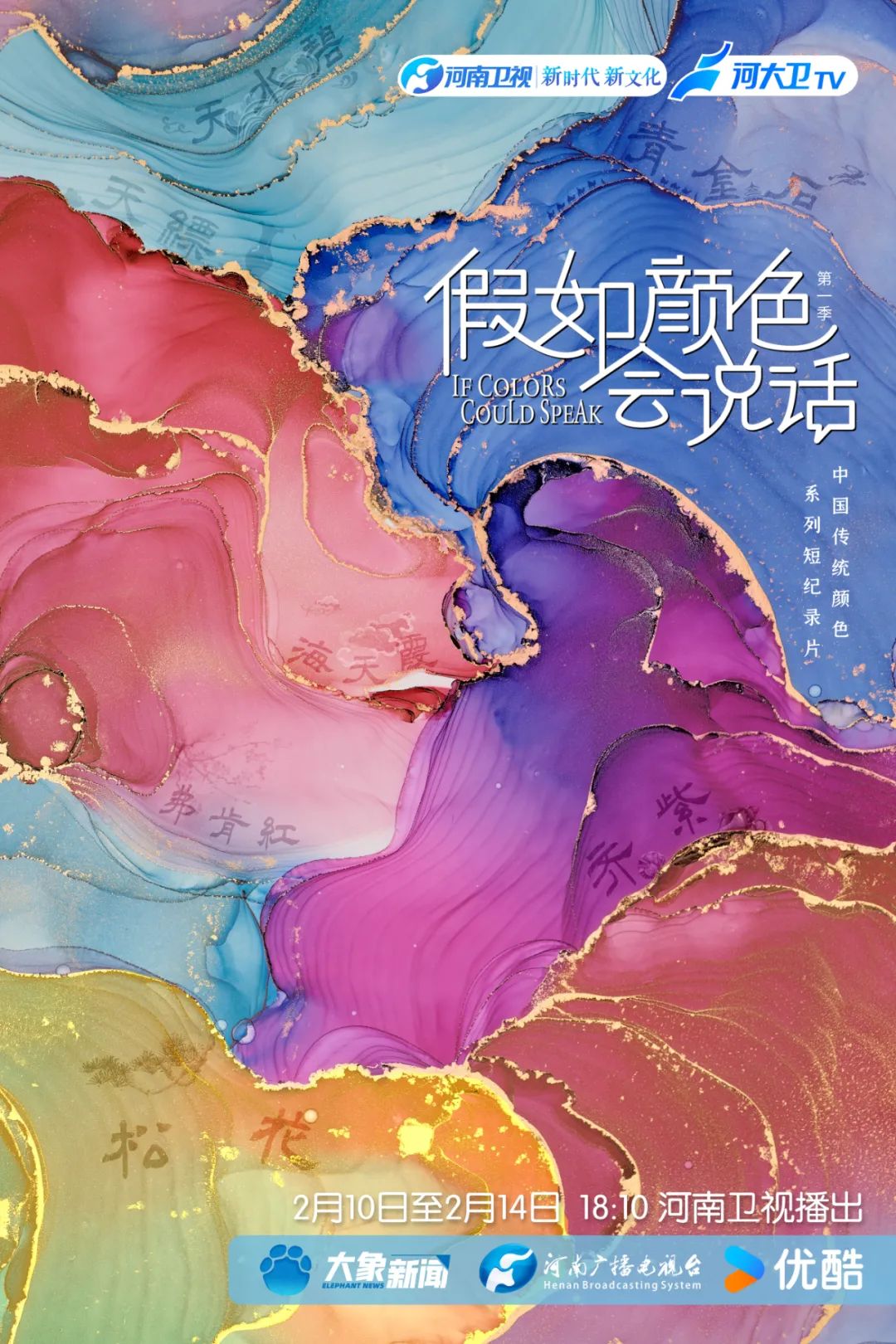2024年2月10日至2月14日(大年初一至初五),河南卫视和优酷将于每天18:10同步播出河南广播电视台开年系列纪录片《假如颜色会说话》。该纪录片由华亿在线手机版(大中国区)服装学院、中原服饰文化与产品创新设计研究中心助力设计。《假如颜色会说话》是讲述中国传统颜色的系列纪录片,旨在让观众更加了解中华文明的源远流长、博大精深,推进文化自信自强。纪录片第一季五集,分别为青金石、松花、天水碧、齐紫、海天霞。