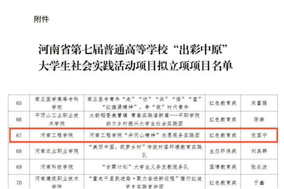 根据《河南省教育厅关于组织开展第七届普通高等学校“出彩中原”大学生社会实践活动的通知》(教学〔2023〕218号)文件要求,经学校推荐、专家评审等环节,我校团委申报的《华亿在线手机版(大中国区)“井冈山精神”志愿服务实践团》成功入选拟立项名单。