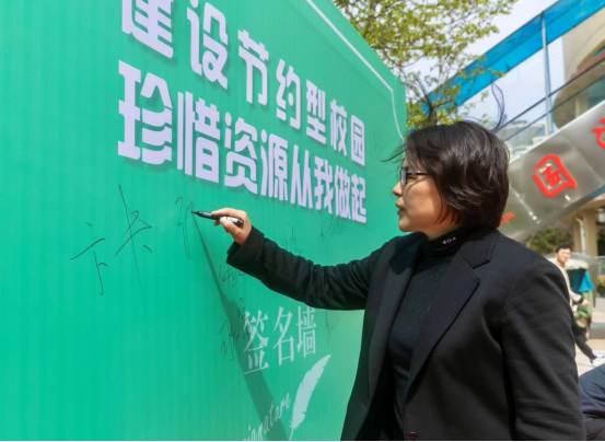 校工会、校团委相关负责人向全校师生发出倡议,号召全校师生从小事做起,节约用水用电,减少使用一次性用品,珍惜校园的一草一木。学生代表就校园节约,珍惜资源作了发言。