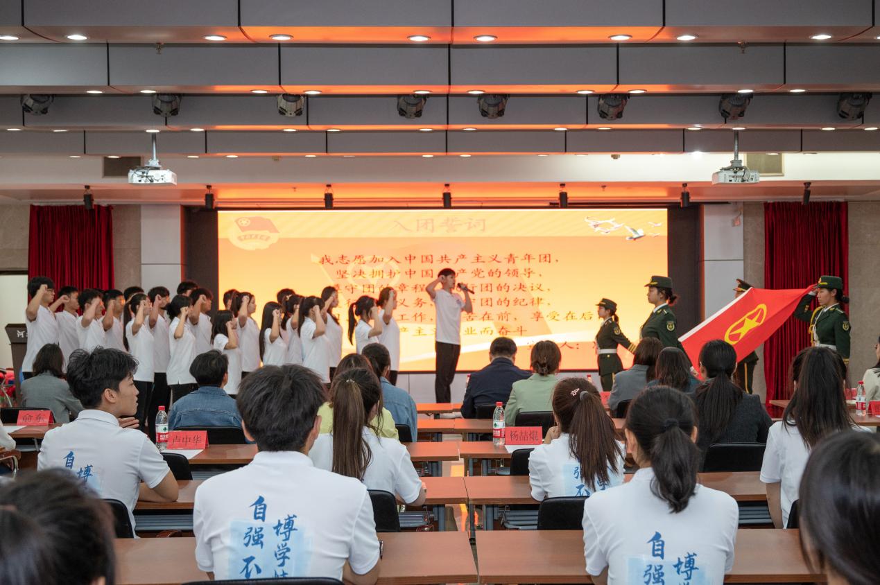 在庄严的国歌声中,入团仪式拉开帷幕。许卫华宣读了入团学生名单,刘超为新团员代表颁发了团徽和团员证。在鲜艳的团旗下,全体团员庄严宣誓,他们右手握拳,高举过肩,以铿锵有力的声音表达了将铭记入团初心,坚定共产主义理想和中国特色社会主义的。