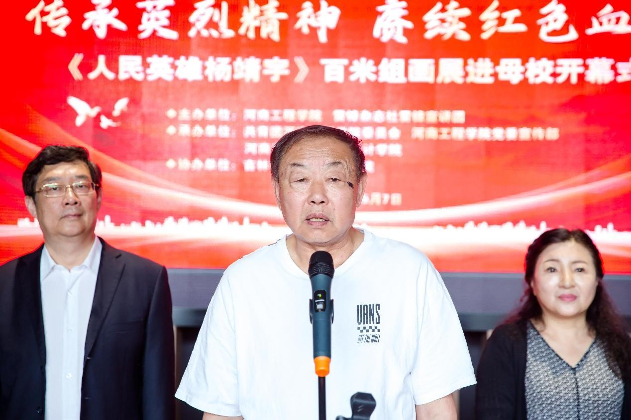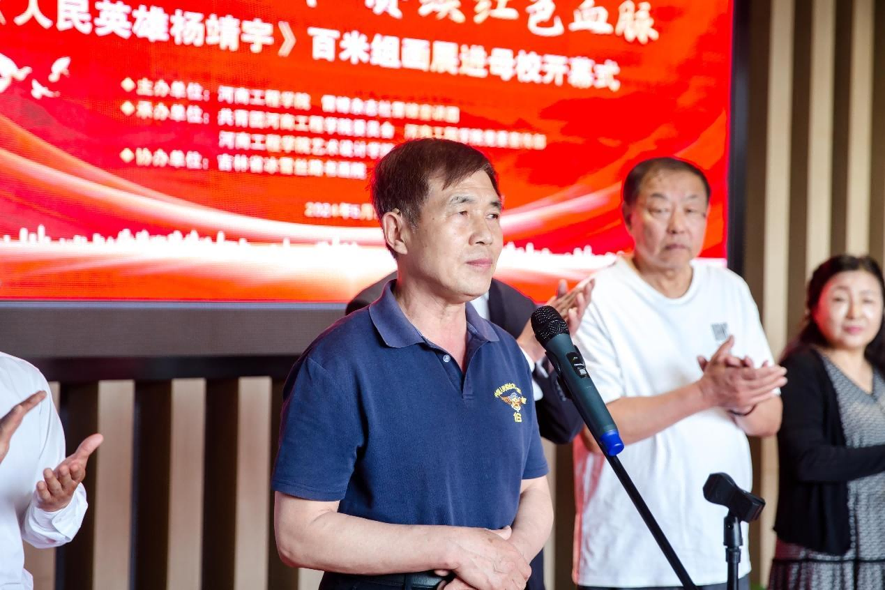 雷锋杂志社、雷锋宣讲团团长卜金宝讲话。他表示,杨靖宇将军坚贞不屈、誓死抗争的民族气节,已经成为中华民族抵御外侮的不朽丰碑。《人民英雄杨靖宇》百米组画进母校是对广大青少年进行红色教育、铭记英雄、追崇英雄、学习英雄的最生动教材。