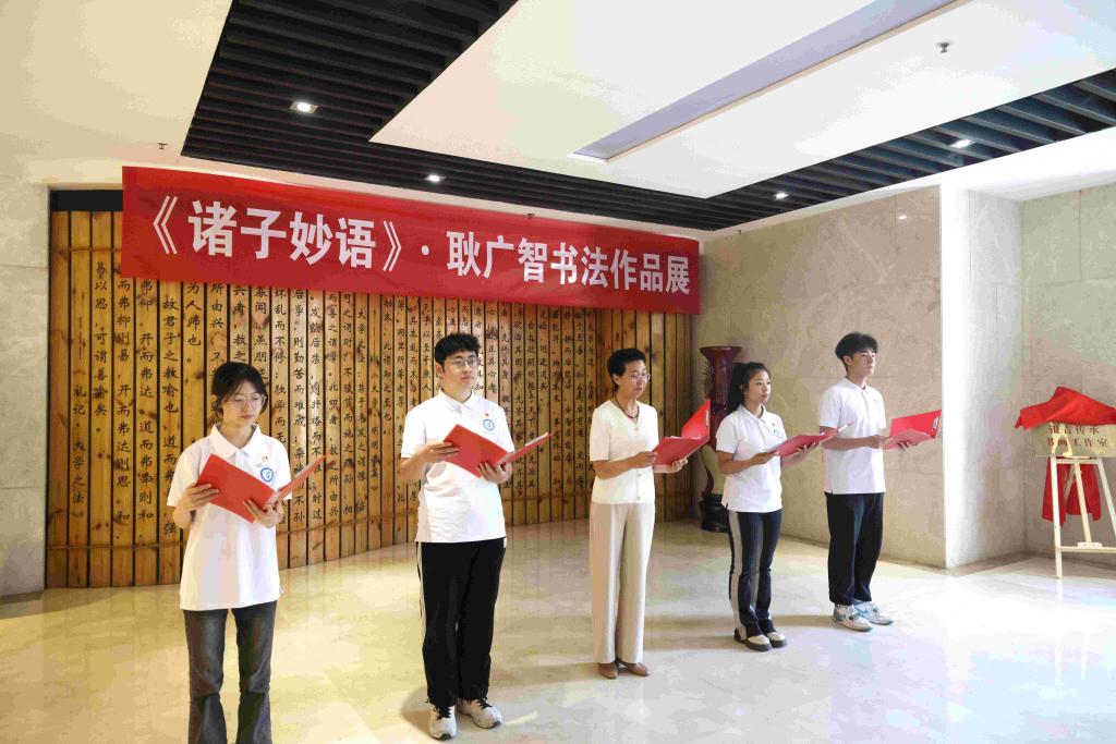 耿广智介绍了本次作品展的创作初心,并表示此次以诸子百家经典语录作为创作内容,旨在弘扬优秀传统文化,提高国学普及水平,让广大师生真切感知中华优秀传统文化的博大精深,厚植中华民族精神,陶冶高尚情操。