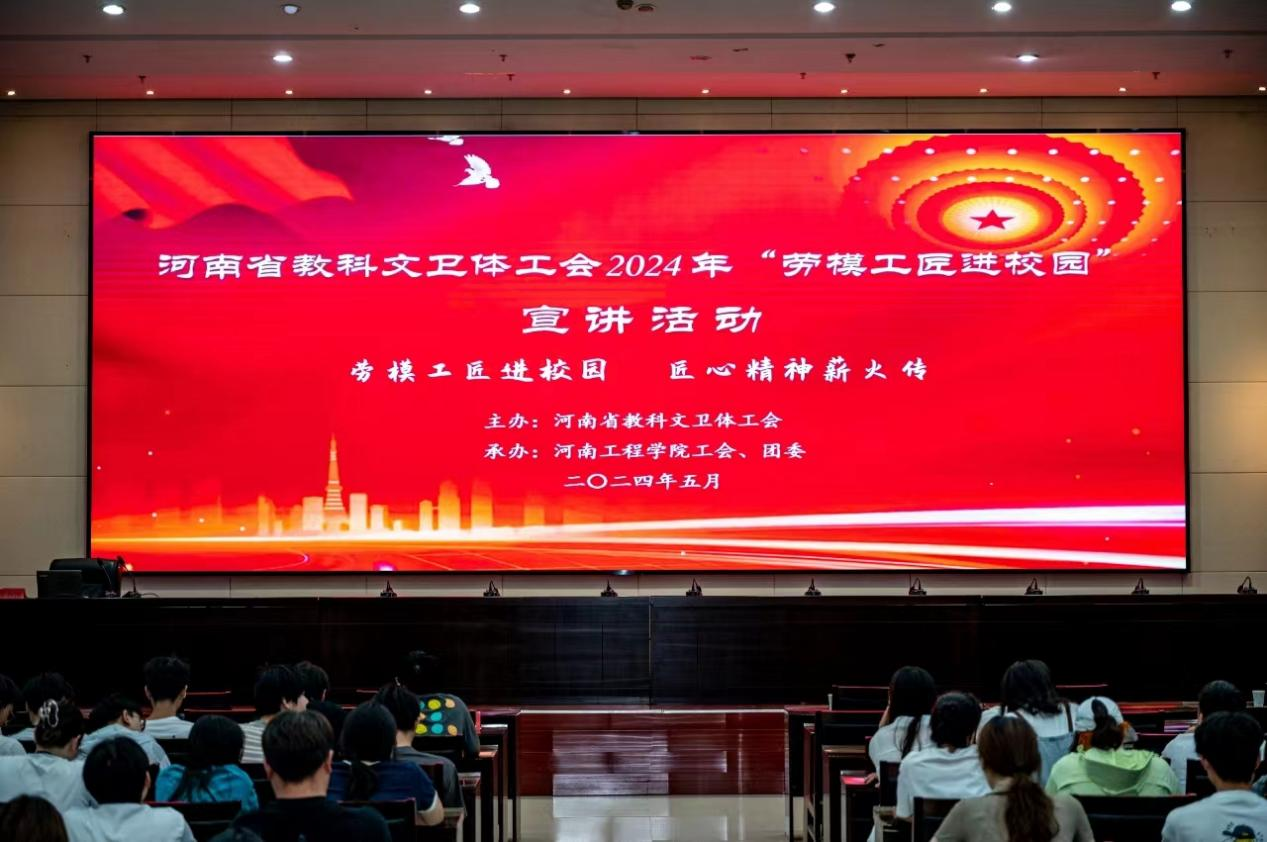 5月30日,河南省教科文卫体工会2024年“劳模工匠进校园”示范宣讲活动在我校举行。河南省教科文卫体工会主席张学勇、河南工程学院党委副书记赵红亮出席活动,校工会、校团委相关负责人和我校约200名师生现场聆听了劳模工匠的先进事迹。