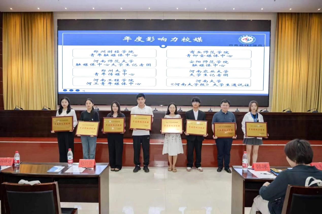 大会现场,对2023-2024年度河南省年度影响力媒体、最具潜力校媒、最具人气校媒和优秀校园媒体等集体获奖单位以及优秀指导老师、优秀校媒人等个人颁奖。我校河工青年媒体中心指导老师闫睿鑫荣获“优秀指导老师”称号,河工青年媒体中心苗育顺、李增鑫荣获“优秀校媒人”称号。