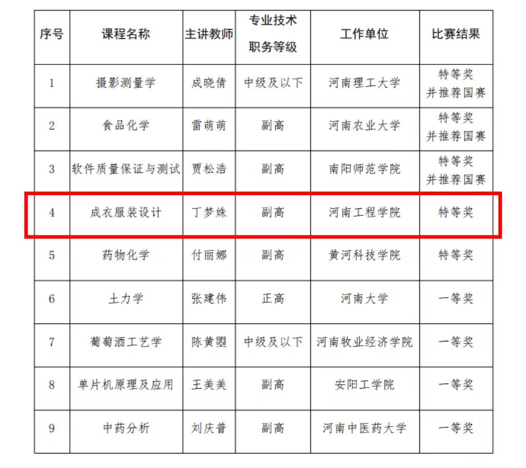 近日,由河南省教育厅主办、河南省高等教育学会承办的第五届河南省本科高校教师课堂教学创新产教融合赛道决赛在郑州轻工业大学成功举办,我校服装学院丁梦姝教师团队荣获产教融合赛道特等奖,这是我校首次在该赛道获得殊荣。