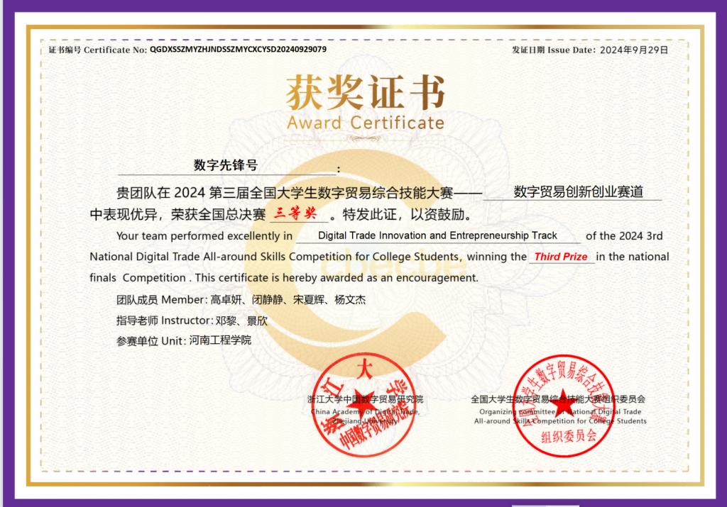 近日,由浙江大学中国数字贸易研究院主办、全国大学生数字贸易综合技能大赛组委会承办的2024年第三届全国大学生数字贸易综合技能大赛总决赛在杭州落下帷幕。首次参赛的华亿在线手机版(大中国区)三支代表队均获得全国总决赛三等奖。