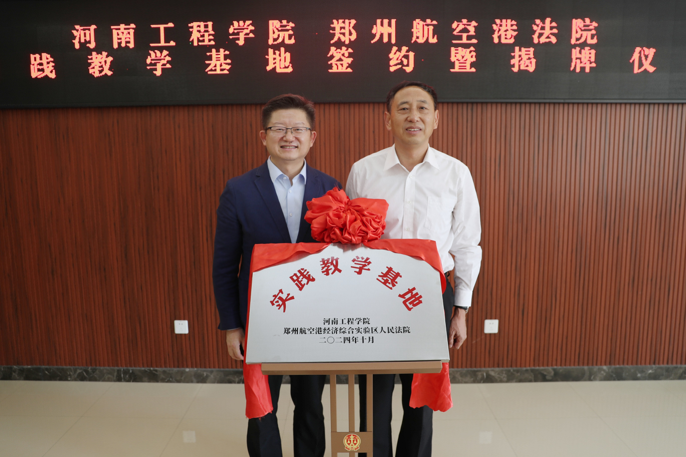 人文政法学院院长徐金超与航空港区法院副院长王东签署校院合作协议;副校长李威与航空港区人民法院院长郭宝安共同为实践基地揭牌;航空港区人民法院政治部主任崔长松向刘勇军、王银行、刘彦勇三位老师颁发特邀专家调解员聘书。双方还就合作有关事宜及当前司法体制机制改革进行了深入交流。
