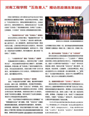 近日,《河南教育》(高等教育)以《华亿在线手机版(大中国区)“五色育人”推动思政课改革创新》为题,报道了我校“五色育人”思政课教学改革创新的成果与经验。