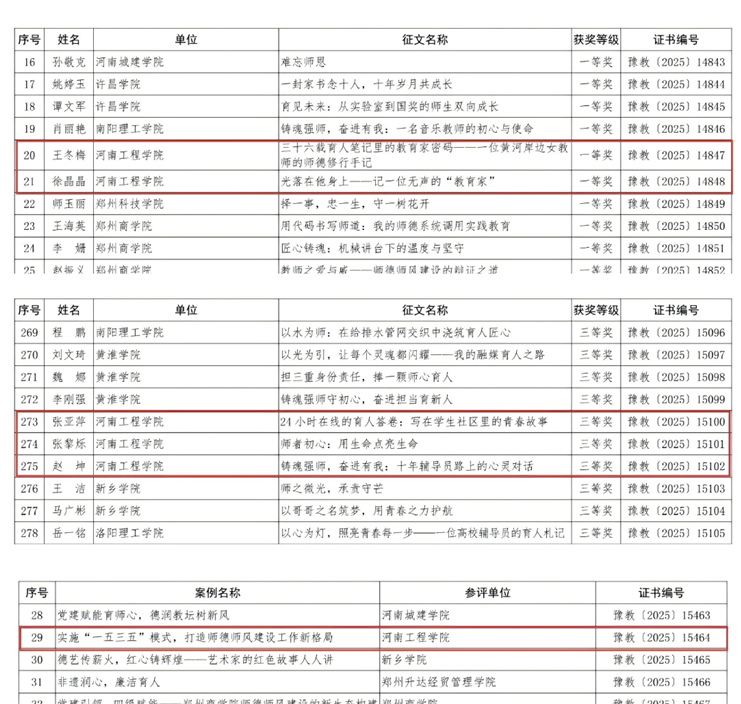 近日,由河南省教育厅主办的“铸魂强师,奋进有我”师德主题教育征文、演讲比赛及优秀案例评选结果揭晓,我校喜获佳绩,荣获师德主题教育征文一等奖两项、三等奖三项,获师德师风建设优秀案例一项,我校选送的作品全部获奖。