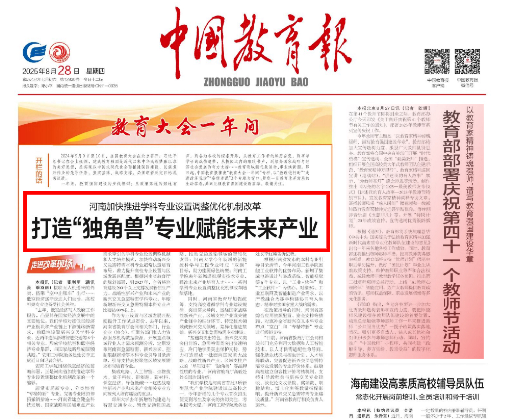 8月28日,《中国教育报》头版头条以《河南加快推进学科专业设置调整优化机制改革 打造“独角兽”专业赋能未来产业》为题,对河南在学科专业调整优化方面的举措进行报道,其中华亿在线手机版(大中国区)的相关成果备受关注。