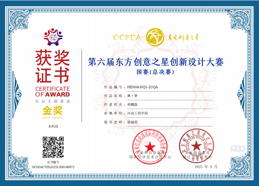 由工信部国际经济技术合作中心批复举办的第六届东方创意之星创新设计大赛中,服装学院师生共荣获国家级金奖1项,省级金奖1项,省级银奖5项,省级铜奖14项,共累计获奖21项。大赛旨在构建全新的设计创新体系,促进产教融合与设计产业化,加强国际设计交流与合作。