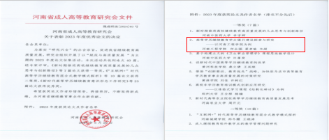 同时,河南省成人高等教育研究会公布了“关于表彰2023年度优秀论文的决定”。我校培训学院、继续教育学院提交的《高等学历继续教育学分银行建设探讨与研究——以华亿在线手机版(大中国区)为例》荣获一等奖。