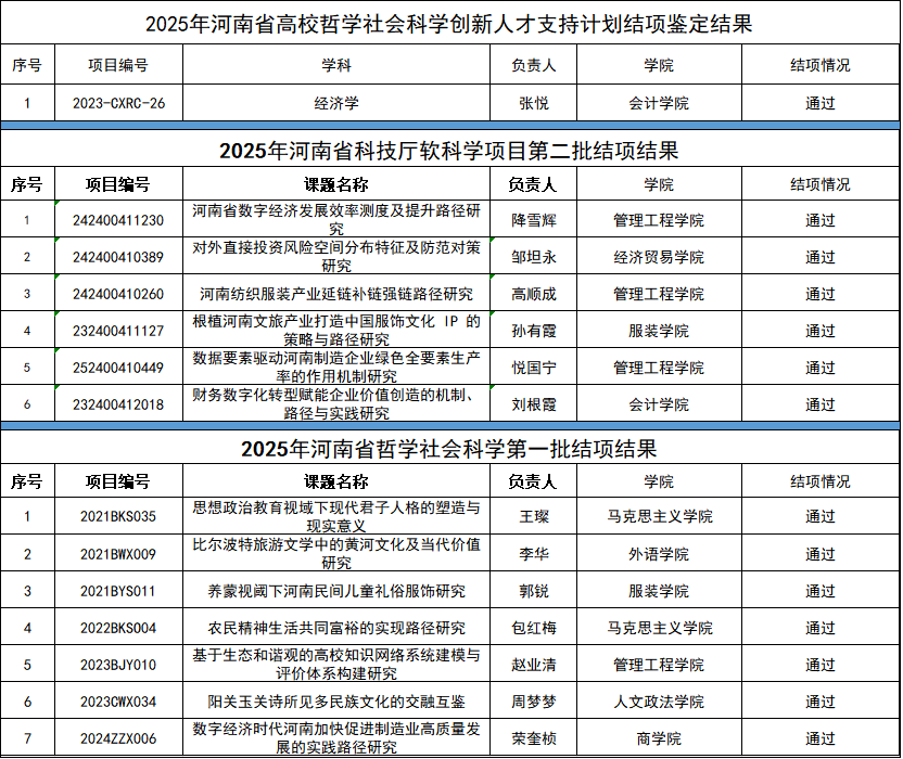 近期,河南省社科事务中心、河南省科技厅、河南省教育厅等部门先后组织了多个类型的社科研究项目的结项工作。我校参加结项的1项河南省高校哲学社会科学创新人才项目、8项河南省哲学社会科学项目、6项河南省科技厅软科学项目均达到结项要求。