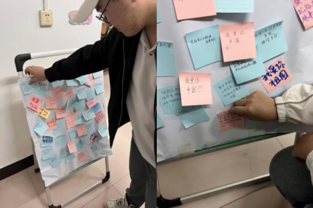 10月4日,“双节寄语墙:一棵可见的‘家国情感树’”活动开展。在校园人流如织之处,“家国情感树”静静矗立,旁边摆放着色彩各异的“思念叶”与彩笔,同学们纷纷提笔,在小小的叶片上写下对祖国、对家人的深情寄语,让家国情怀满溢其间。