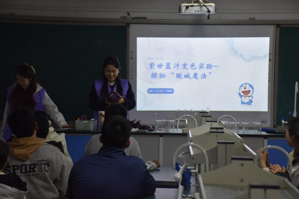 近日,一场以紫甘蓝汁变色实验为核心的 “化学魔法探索课”,在郑州市第五十一中学的实验室顺利开展。本次活动由化工与印染工程学院联合郑州市第五十一中学举办,旨在打破学生对化学“抽象难学”的固有认知,通过紫甘蓝汁这一贴近生活的天然原料,直观呈现酸碱反应的奇妙变化,激发学生对化学学科的学习兴趣与探索热情。