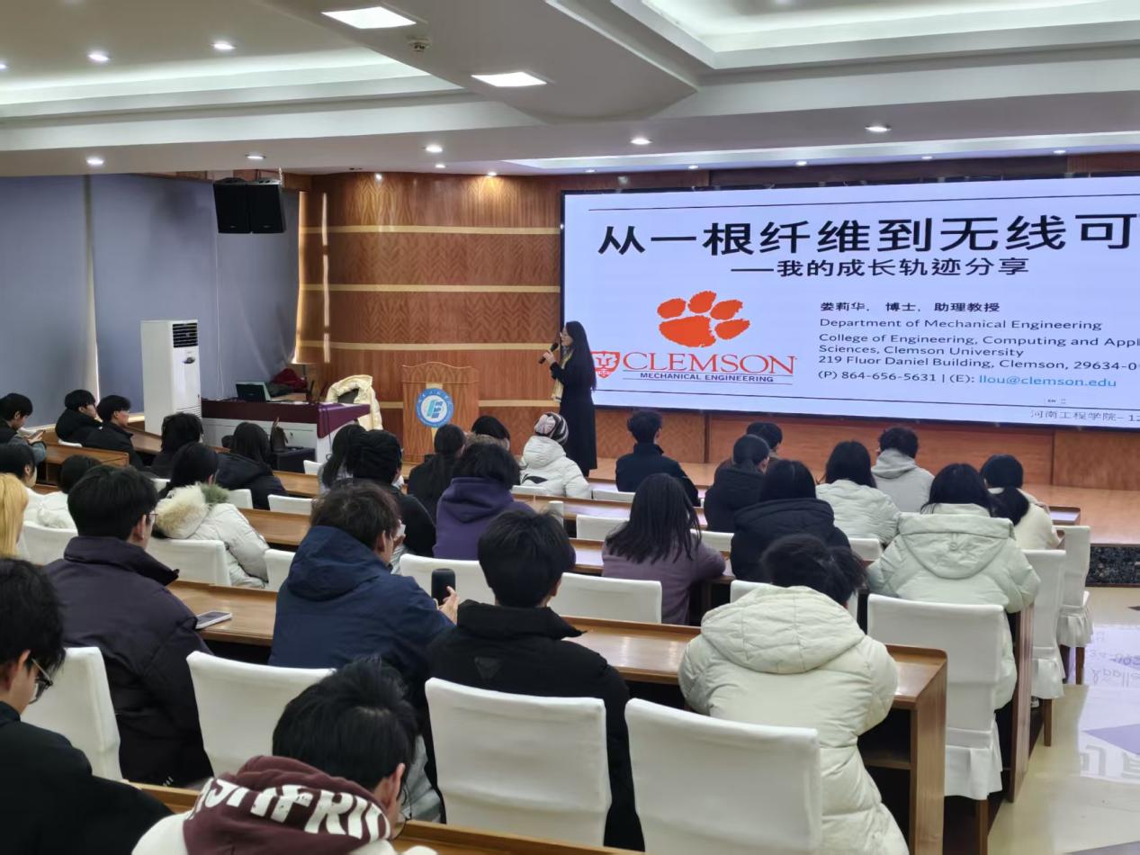 为弘扬河工精神,凝聚校友力量,激励在校学子,引领在校生树立远大理想,科学规划大学生涯与职业发展,助力学生成长成才。12月26日下午,纺织工程学院在桐柏路校区学术报告厅举行“榜样引领,赋能成长”优秀校友报告会。本次报告会邀请美国克莱姆森大学教师、我校纺织工程专业2013届优秀毕业生娄莉华作报告。